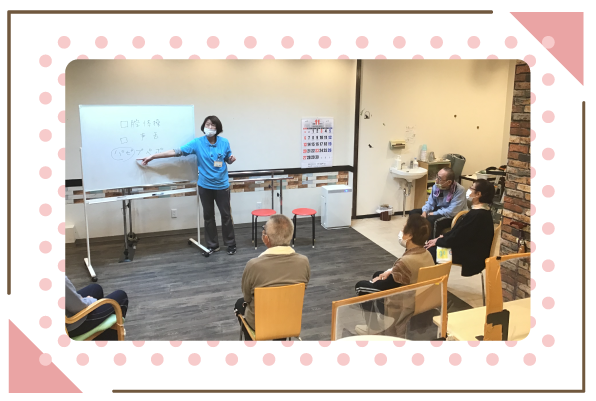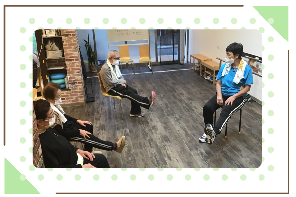 「認知症予防」の為のプログラムとして、二重課題運動を実施させていただいてます。手と足を同時に違う動きをすることで、脳へ血流をアップさせていきます。 「誤嚥性肺炎予防」の為のプログラムとして、「口腔体操」を実施。大きな声を出して早口言葉や舌を動かす運動を行います。